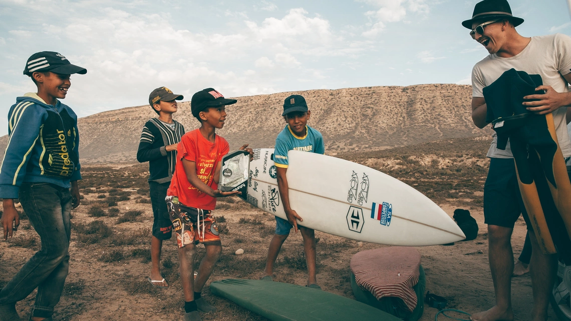 Es ist 3:30 Uhr in der Nacht als Remi uns mit frischem Kaffee weckt und ins Auto schleift. Wir fahren entlang der Küste in Richtung Sonnenaufgang, dem Swell entgegen. Stundenlang cruisen wir durchs Niemandsland, bis wir die Lichter einer kleinen Stadt sehen. Obwohl es gerade erst zu dämmern beginnt, herrscht bereits reges Treiben auf den Straßen. Frisches Fladenbrot, direkt aus dem Holzofen und jede Menge Amlu (das marokkanische Pendant zu Nutella) bilden eine solide Grundlage für einen anstrengenden Surftag. Nur noch ein kurzer Fußmarsch trennt uns vom Meer. Bereits von Weitem können wir die Lines, die auf die Küste zurollen, sehen und mit jedem Meter, den wir dem Spot näher kommen, steigt die Vorfreude. Perfekte Chocolate Barrels an einem einsamen Strand irgendwo in Marokko. Und das Beste: weit und breit keine anderen Surfer in Sicht. Die drei Jungs können es kaum glauben. Lenny ist der erste im Wasser und setzt mit seiner ersten Welle, einer cleanen, kopfhohen Barrel, die Messlatte für den Tag. Den ganzen Vormittag rollen scheinbar endlose Lines in die kleine Sandbucht. Nach der zweiten Session machen wir uns erschöpft aber super stoked auf den Weg zurück. Beim Abendessen stoßen wir auf den erfolgreichen Tag an und mutmaßen über den Nächsten. Denn der Peak des Swells steht uns noch bevor.