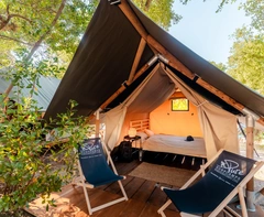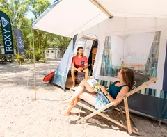 Die Bungalows sind ausgestattet mit Licht, Strom und Betten inkl. Decken und Kissen für insgesamt 4 Personen. Die Bungalows verfügen alle über eine überdachte Veranda.